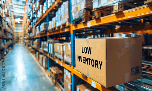 Cardboard box with LOW INVENTORY label on a warehouse shelf, indicating stock shortages and supply chain management issues in a distribution center