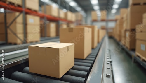 Cardboard boxes on conveyor belt in modern warehouse. Boxes being sorted for delivery shipping. Warehousing logistics transportation. Industry, business, distribution, post service, logistic.