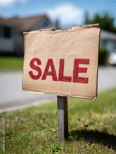 sale, signs, cardboard, discount, deal, offer, promotion, advertise, marketing, handwritten, text, display, grass, street, outdoors, sunlight, advertising, economy, business, retail, bargain, announcement, summer, eye-catching