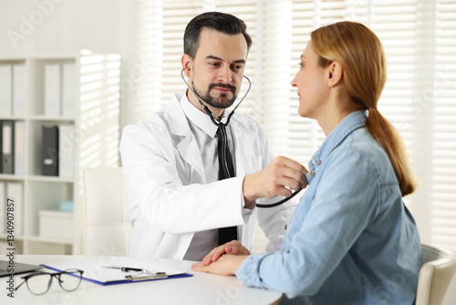 Cardiologist with stethoscope listening patient's heartbeat at desk in clinic