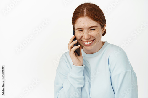 Carefree young woman laughing over phone call, talking on smartphone. Redhead girl chuckle and smile during cellphone chat, happy conversation, white background