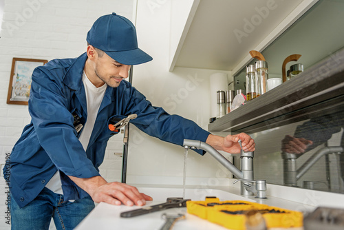 man, hold, work, water, tap, run, professional, service, handyman, tool, plumber, guy, sink, caucasian, countertop, attentive, concentrated, job, male, occupation, construction, uniform, kitchen, home, interior, house, renovate, reparation, photogenic, apartment, residential, white, leaking, adult, repair, racked, modern, equipment, smile, executive, inspection, spanner, planner, lifestyle, drill, open, shelf, incline