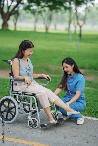 Caregiver help Asian elderly woman disability patient sitting on wheelchair in park, medical.