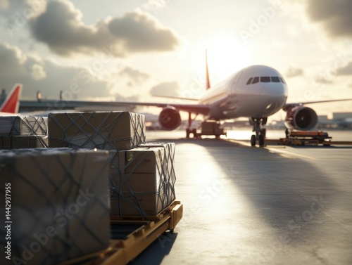 cargo, aeroplane, aerodrome, logistic, freight, transport, shipment, delivery, air travel, shipping, package, loading, sunset, good, travel, aerial, flight, warehouse, export, import, business, trade, distribution, sky, transportation, industry