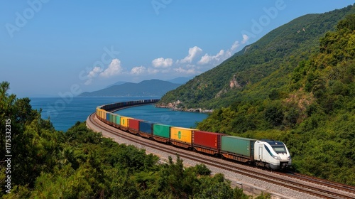 Cargo management ensures secure transportation. Train traveling along a scenic coastal route with colorful containers.