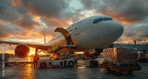 Cargo Plane Loading at Sunset. Cargo plane being loaded with freight at sunset, with workers and equipment in action on the tarmac.