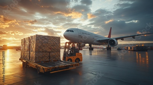 cargo, aeroplane, unloading, logistic, aerodrome, forklift, freight, shipping, transport, package, pallet, warehouse, aviation, transportation, ground, supply, handling, distribution, global, delivery, industrial, operation, terminal, infrastructure