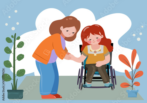 acceptance, accessibility, assistance, caring, compassion, empathy, empowerment, encouragement, friendship, happiness, health care, healthy living, hope, inclusion, kindness, love, motivation, nurturing, quality of life, rehabilitation, resilience, special needs, teamwork, trust, understanding, wellness, wheelchair, vector, cartoon