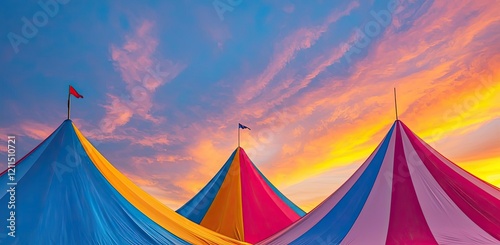 Carnival celebration idea. Colorful circus tents against a vibrant sunset sky, creating a festive atmosphere.