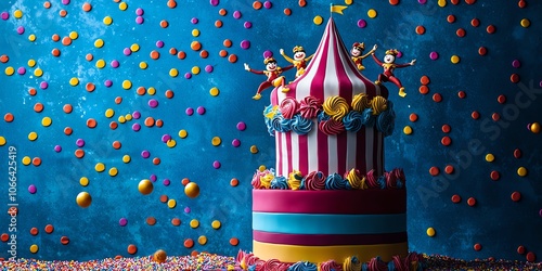 carnival, circus, birthday, cake, surprise, acrobat, candy, stripes, tier, whimsy, invite, guest, balloon, design, candle, pop, cheer, dessert, topper, joyful, juggle, puckered, party, funfair