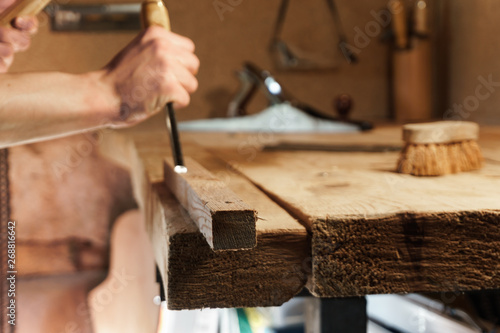 Carpenter carving wood with a chisel