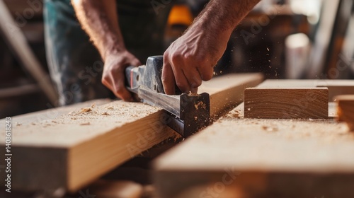Carpenter cutting wood at a construction site. Featuring craftsmanship and focus