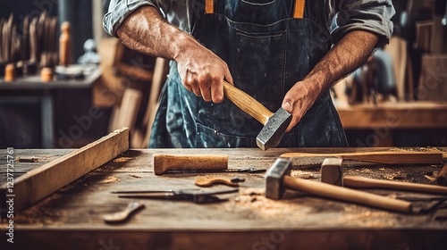 Carpenter Hands Hammering Wood Craftsman Workshop