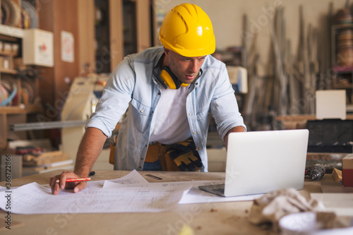 woodworker, carpenter's shop, workshop, blueprint, laptop, craftsman, working, blueprint, diligent, serious, concentrated, design, looking, carpenter, attractive, modern, technology, craft, handyman, digital, architecture, wood, factory, paper, scheme, vignetting, helmet, industrial, analysing, thinking, searching, cyberspace, skilful, dedicated, young, man, watching, plan, material, tool, tool belt, blue-collar, preparation, artisan