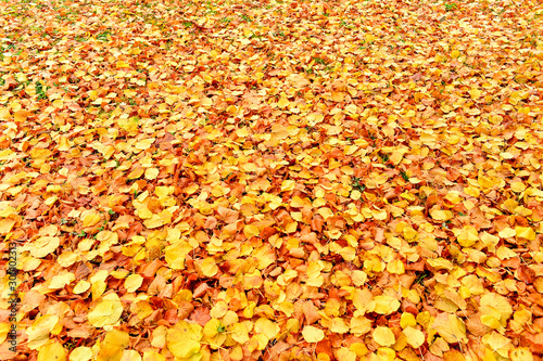 Carpet of fallen yellow leaves in autumn on the ground. Background