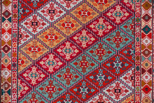 Carpet Texture, Abstract Ornament. Colorful Oriental Mosaic Carpet With Traditional Ornament. Patterned Carpet. Closeup View Of Handmade Woven Carpet.