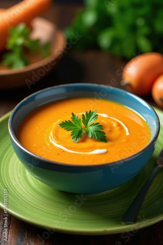 Carrot soup puree with sauce in blue bowl on green placemat, placemat, carrotpuree