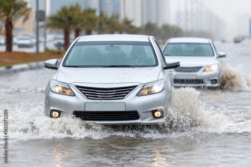 car, flood, city, rain, water, splash, driving, wet, traffic, emergency, road, danger, urban, storm, headlamp, motion, cloudy, vehicle, rainy