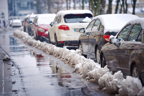 Cars stuck under feet of plowed snow. Car stucked after snow removal works. Parked cars buried in snow after snow plow. Selective focus.
