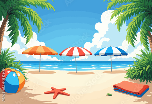 Cartoon Beach Scene with Umbrellas and Beach Ball