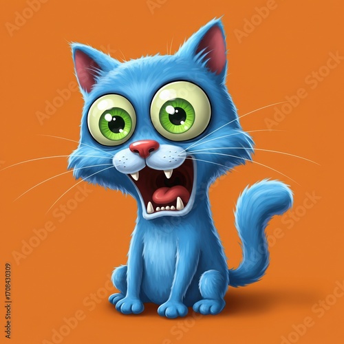 cat, cartoon, blue, animal, funny, cute, illustration, character, design, art, graphic, playful, happy, big eye, green eye, orange, background, fur, whisker, mouth, teeth, tongue, open, smiling, joy, cheerful, vibrant, colours, comic, whimsical, creature, pet, domestic, felino, adorable, bright, friendly, expression, emotion, animated, digital, drawing, artwork, studio, isolated, sitting, tail, paw, ear
