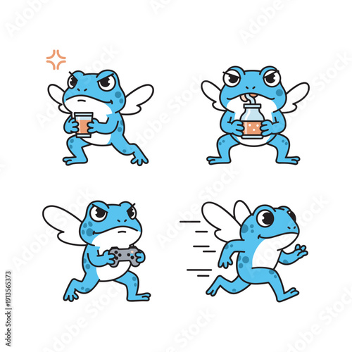 Cartoon blue frogs enjoying coffee, gaming, and flying in a fun and playful style