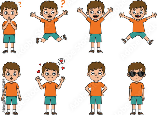 Cartoon boy character emotions, kids expressions illustration, happy, sad, surprised, love, cool, playful, educational, emotional poses, vector art