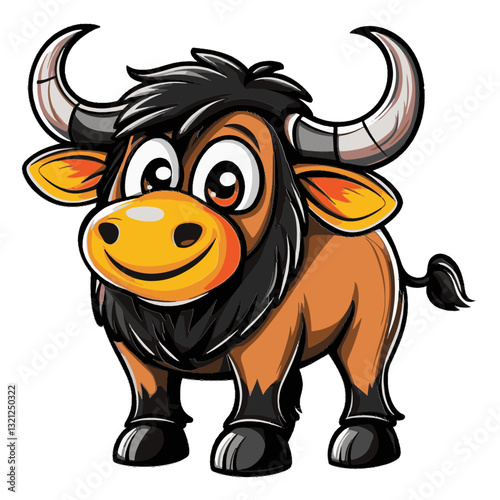 bull, cartoon, animal, horn, powerful, strong, muscular, black, grey, orange, white, eye, nose, hoof, tail, fur, illustration, vector, graphic, design, isolated, white background, mammal, wildlife, nature, creature, detailed, line art, shading, farm animal, farm animal, agriculture, symbol, aggressive, mascot, clip art, digital artwork, bold, confident, half face, dynamic