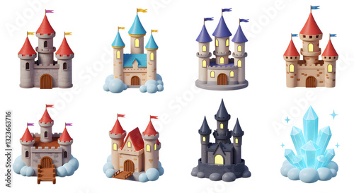 Cartoon Castles Collection with Crystals on Transparent Background for Fantasy Story