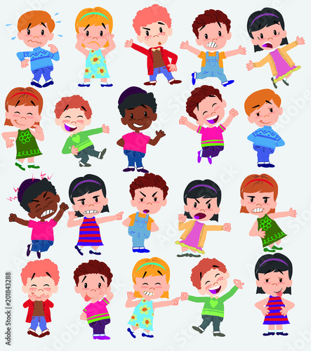 Cartoon character boys and girls. Set with different postures, attitudes and poses, doing different activities. Vector illustrations.