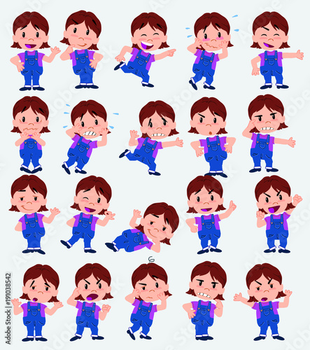 Cartoon character white girl. Set with different postures, attitudes and poses, doing different activities in isolated vector illustrations.