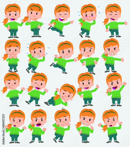 Cartoon character white girl with sweater. Set with different postures, attitudes and poses, doing different activities in isolated vector illustrations.