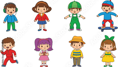 Cartoon children in colorful outfits, dancing, cooking, painting, music, science, fun activities, educational creativity, vector illustration for kids