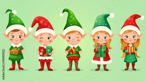 elf, christmas, santa, claus, holiday, winter, christmas, santa, snow, tree, cartoon, gift, celebration, illustration, hat, greeting, snowman, decoration, merry, happy, card, snowflake, fun, december, christmas tree