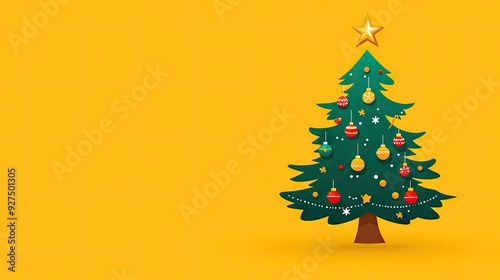 Cartoon Christmas tree with ornaments and a star on a yellow background, room for holiday messages.