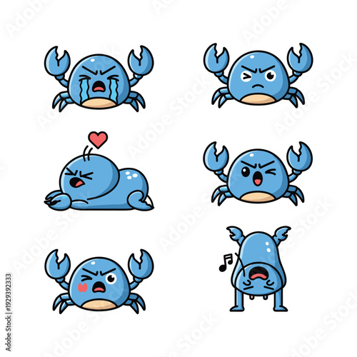 Cartoon crab characters with different emotions and expressions on white background
