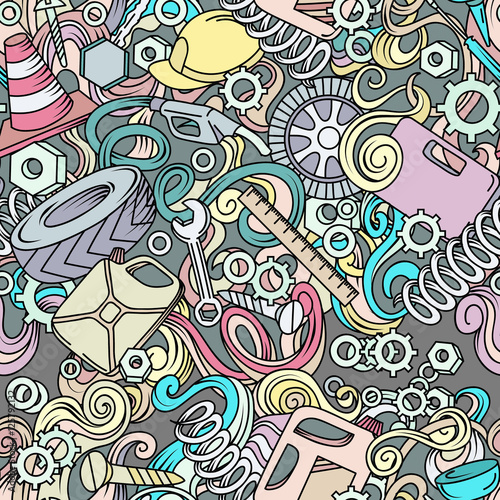 Cartoon cute doodles hand drawn Auto service seamless pattern.