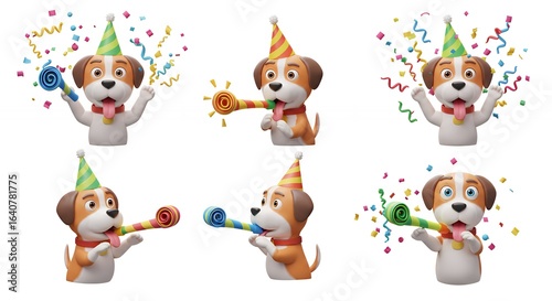 dog, cartoon, celebration, party, animal, illustration, festive, colourful, comical, character, party hat, doggy, horn, confetti, happy, excited, cute, celebratory, clip art, digital artwork, adorable, design, isolated, animation, image, graphic design, pet, animal, multi, white background