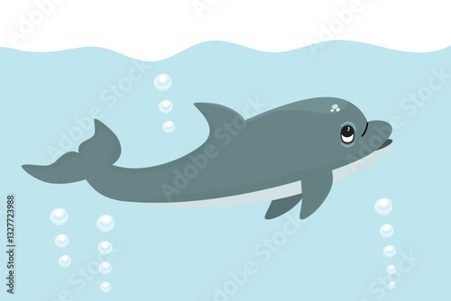 Cartoon dolphin swimming underwater with air bubbles. Cute animal character looks up at the surface of the sea. Blue, grey and white colors. Print on fabric and paper. Vector flat illustration.
