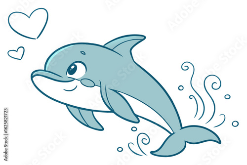 Cartoon dolphin vector art, cute and playful, minimal flat design, soft blue tone, white background