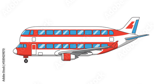 Cartoon Double-Decker Airplane with Red and White Livery and Blue Windows.