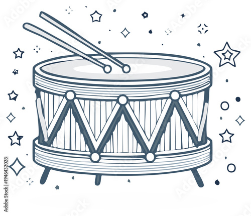 Cartoon drum illustration with drumsticks, outline drawing, star decorations.