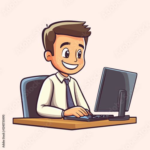 Cartoon employee sitting and typing on a laptop vector illustration