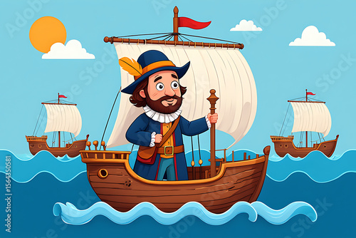 explorer, captain, ship, boat, sailing, sea, ocean, water, voyage, adventure, discovery, travel, maritime, nautical, history, cartoon, illustration, character, man, male, beard, hat, feather, blue, sky, sun, cloud, sail, mast, flag, red, wooden, vintage, old, exploration, journey, transportation, vessel, seafaring, sailor, pirate, caravel, galleon, childlike, whimsical, friendly, joyful, bright, colourful