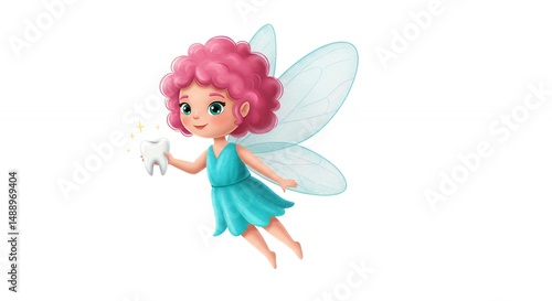 Cartoon fairy holding tooth illustration with pink hair and turquoise dress