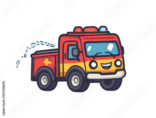 Cartoon fire truck with water spraying from a nozzle smiling face design transparent background