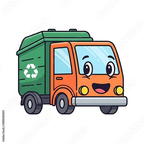 garbage, truck, recycling, waste, cartoon, illustration, green, orange, smiling, face