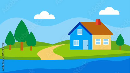 house, tree, cloud, sky, landscape, cartoon, green, blue, path, river, grass, hill, door, window, roof, chimney, water, field, land, nature, scene, countryside, rural, view, design, illustration, art, drawing, graphic, image, background, element, shape, light, colours