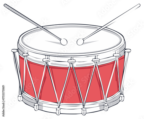 cartoon, illustration, drum, drum, snare, musical, instrument, music, sound, rythm, beat, percussion, stick, noise, entertainment, concert, festival, red, white, equipment, play, playing, drummer, march, marching, band, band, parade, vector, graphic, isolated, object, design, art, drawing, vignetting, studio, practice