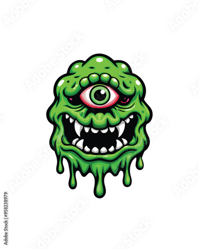 Cartoon illustration of a three-eyed gooey monster with neon green slime dripping from its mouth.